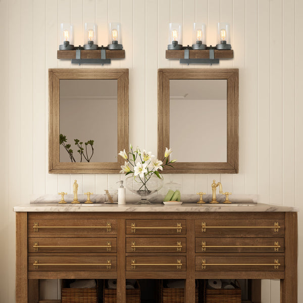 For creating a focal point and highlighting the mirror and sink area, the downward-facing wall sconces with clear cylindrical glass shades will work best. The three and four-light fixtures with faux wooden panels affixed on metal attachments can give a sophisticated look. However, you can also choose the bathroom vanity lights with conical clear glass shades for two and three lights attached with a distressed wooden panel surrounded by an aged silver frame.