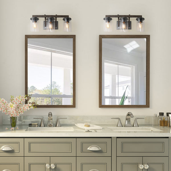 Upward-facing vanity lights can offer an excellent reflection of warm lights and if you want a uniform reflection of light in the entire bathroom, check out the two, three and four-light fixtures with seeded cylindrical glass shades. You can either choose vanity lighting with a distressed wooden panel or the ones with only metal frames or even the frames with wood and metal combination. Faux wood, uniformly black, distressed wood or brushed antique silver –there are different color variants to choose from according to your bathroom setup and wall paint.