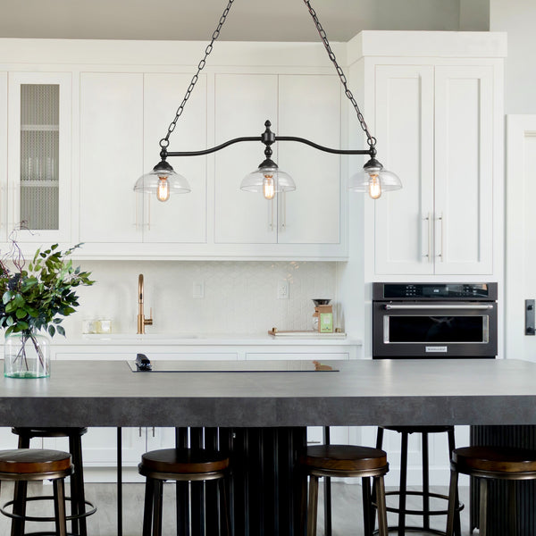 Place even number of large pendant lights over the counter tops and the kitchen island. Long and oval dining tables work well with linear suspension or multi-lighting settings. Whereas square and round tables require only a single spotlight source overhead.