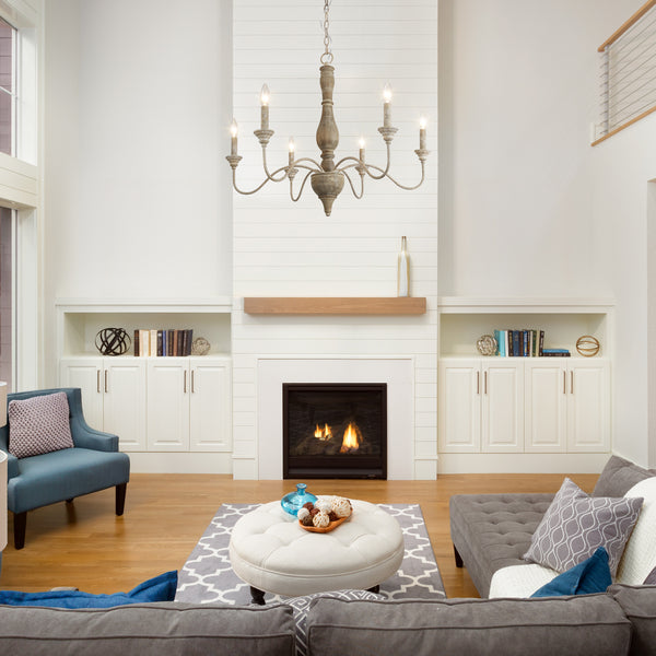 The fireplace is identifiably a cozy area for reading and snoozing continues feeling the warmth even when it’s not wintering with the silver finish wood chandelier. A dramatic centerpiece for the ceiling above, the silver body emulates low key sophistication. The six sockets fashioned like candle holders illuminate the space with a smooth glow. Neither too bright nor too dim the light drawn from these modern chandeliers set soothing vibrations for repose.