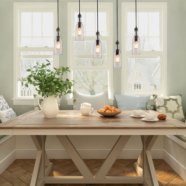 Those having a country style décor for kitchen and dining space can check out the farmhouse pendant lighting which offers a vintage and rustic vibe through warm dispersed lights. The 14.6”x4.1” Mason Jar light with adjustable 59” chain can be hung from flat, sloped and vaulted ceiling effortlessly, so can the Glass Bottle Chandelier light with 72” cord. Another Mason Jar Pendant light option can be the 6.7”x3.9” variant with woven 14.7 feet cord that can be adjusted according to the size of kitchen island and tabletop.