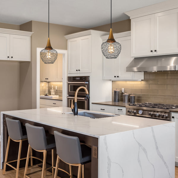 Two or more metal cage hanging pendants, upward facing cylindrical pendants and light champagne golden wire caged lights can be hung from different heights as pendant lights for kitchen. The rustic wooden crisscross frames coupled with bronze metalwork can complement the beige linen cover surrounding the warm light so that you can enjoy your culinary work or dinner in peaceful ambience. Also check out the mesh caged pendants and the transitional pendants with dome glass shades for a cozier experience.