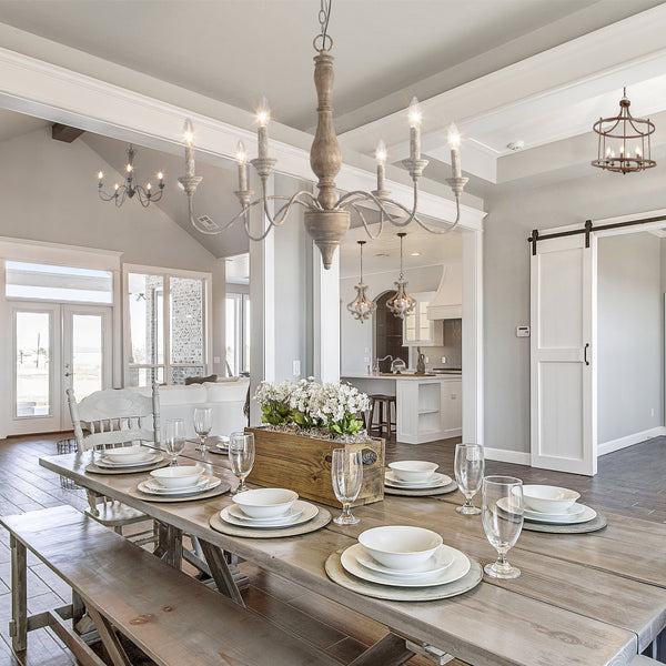 The rust finish 32.7”x31.1” chandelier is hardwired and suitable for dry ambiance. It has dimmable antique blubs and the French country chandelier wood column has a rustic worn look that perfectly complements the scroll arms with wooden danglers. Another classic silhouetted chandelier has six detailed and curved iron arms coming out of a spindle-shaped wooden body. This traditional chandelier of 30.3”x30.7” dimension can be combined with a dimmer switch just like the 6-light candle styled chandelier with a dimension of 24.4”x29.5”. It is not only UL listed ensuring safety, but also offers a rich vintage look with the rust arms and distressed wood column. Hang it from flat, vaulted, slanted or sloped ceiling or just use the dimmer switch for warm lighting –the choice is yours.