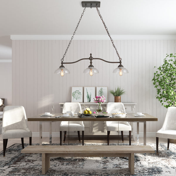 Linear and non-linear Mason Jar light fixtures with seeded glass as well as the clear glass bottle linear chandeliers will be most maintenance-friendly for your kitchen island. At the same time, you can also check out the cylindrical clear glass 3-light and 5-light pendants or the frosted glass cylindrical light fixtures on metal or wooden bases. Cages light chandeliers and metal pipe fixtures are also excellent options for your kitchen.