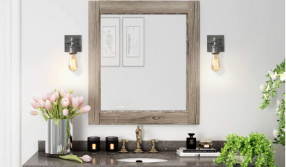 If you are looking for bathroom vanity lights to highlight small area, go for single fixtures with cylindrical bubble glass shades. You can install these lights on either side of a mirror or above a small mirror or go for two such single fixtures and place each on each side of the mirror. The black metal sconce with rectangular base and rectangular frame offers an upscale look while the distressed wooden sconce with brushed silver holder offers a rustic look.