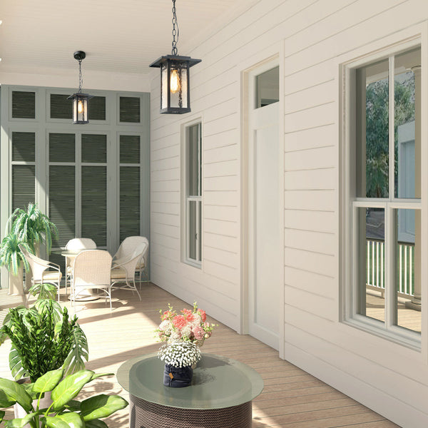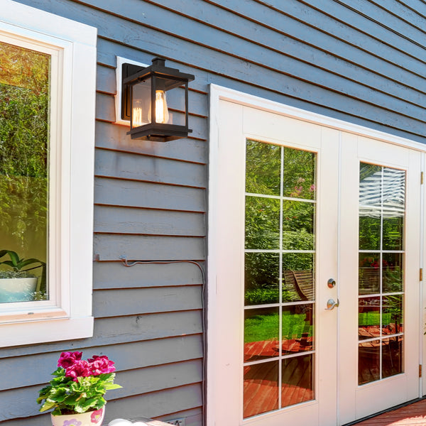 For simple outdoor wall lighting, you can check out the 10.6”x6.1” industrial retro light with an aluminum black finish and clear glass shade or the 12.2”x5.9” accent wall lamp with seeded glass shade. The 11.8”x4.3” farmhouse lantern with clear waterproof glass shade and light-weight shockproof aluminum fixture in a rectangular box shape can be a prospective outdoor choice. If you prefer the seeded glass variant, the 11”x8.7” lantern in iron and black finish, 12”x8” textured glass transitional lantern, 11”x4.7” textured glass wall sconce and 13.4”x4.9” transitional black lantern can meet your requirements.