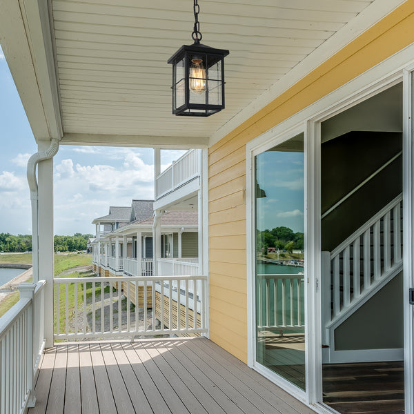 Create a colonial vintage look with the lantern styled outdoor hanging lights which brings back the nostalgia with clear, seeded, bubble or obscured patterns on the glass shades. What is striking in these fixtures is that all of these hanging lights have adjustable chains connected to the canopy so that no matter whether your ceiling is vaulted, sloped, plain or slanted, hanging the lights is never an issue.