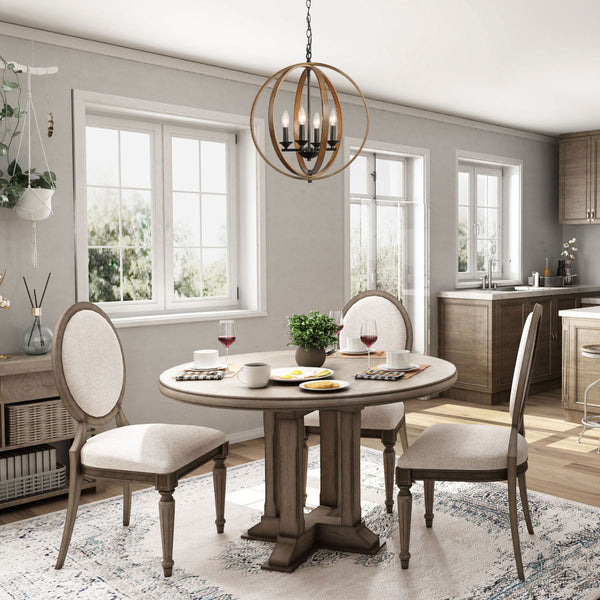 There is no dearth of creativity with wooden frames when if you are up for some geometrical light fixtures. For elaborate modern farmhouse pendant lighting, the 20” wide orb made of three faux wood rings in crisscross from surrounding four candlelight fixtures looks as elegant as the geometric pendant chandeliers that are available in all wood construction as well as in wood and metal fusion. For extravagant living room lighting, check out the wooden orb chandelier with 3 lights and crystals, the 4-light lantern chandelier, the hand-crafted white wooden drum chandelier and also the 15” globe chandelier with metal ring.