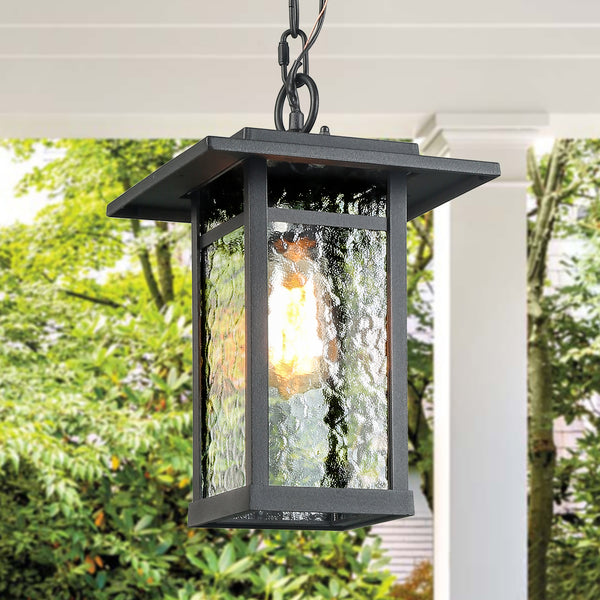 If you are looking for classy outdoor hanging lights with a rustic and vintage touch, the clear seeded glass lantern and obscured glass lanterns can be excellent choices as their textures shades offer transitional lighting across the garden, barbecue area and more. The non-dimmable seeded glass light comes with black metal base and mission-styled accents while the dimmable farmhouse-styled obscure glass light comes with an adjustable chain and round canopy that is compatible with all types of ceilings.
