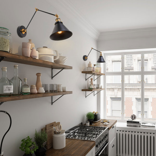 If you are looking for kitchen or bedroom wall lights, the up and downward moving swing arm sconces can be the most flexible options. These fixtures are hardwired for usage in a dry area and have a plug-in system with a long cord so that turning on and off the lights become easier. One of the classic designs is the fixture with black matte shade and antique brass joints which look best in a sophisticated household. For a more laid-back setup, you can check out the fixtures with brushed silver and champagne gold Finnish. If the metal bell shades look conventional to you, there are clear glass shades in the brass and black metal finish as well as brushed silver finish.